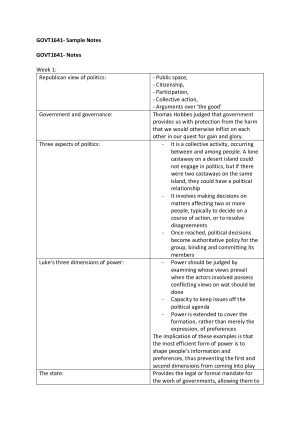 GOVT1641 Introduction to Politics Notes. Notes cover all content and are summarised in weekly tables, where information is clearly outlined next to concept. Topics covered: - Liberalism - Liberalism’s Critics - Democracy - Justice - Rights - The Executive - The Judiciary - The Legislature - Interest Groups - Parties - Movements