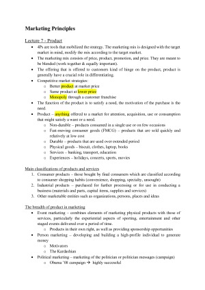 The notes include all content from the lecture and textbook from week 7 -12 that are assessed in the final exam. Topics: products, new product development, promotion topics (advertising, PR, direct selling, digital marketing, etc.), price, place