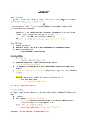 Very detailed procedures and case summaries - these notes are your guide through the exam and can be copy/pasted into an exam response. Topics Covered: -Agreement -Consideration -Intention to Create Legal Obligations -Certainty -Formalities -Capacity -Privity -Express & Implied Terms -Unfair Contract Terms -Consumer Guarantees -Estoppel