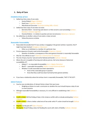 These notes are a complete guide through your exam. Follow them step by step in order to get a great mark. As simple as copy and paste so look no further! Topics Covered: -False Imprisonment -Trespass to Land -Nuisance -Negligence