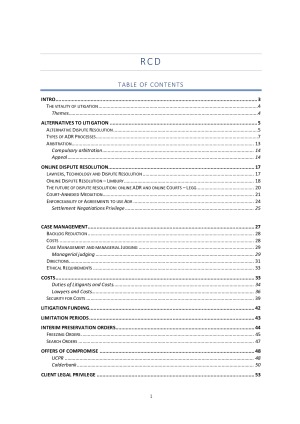 I created and used these notes in Term 1 2019 to achieve a HIGH DISTINCTION in RCD. This includes both FULL, DETAILED NOTES from ALL course readings AND a SUPER SUMMARY used in the exam to achieve a mark of 89. The full notes include summary of all course content in the form of detailed summaries to ace CP, diagrams and legislation tables. Whilst the exam SUMMARY is scaffolded to answer problem questions in detail. The following topics (from the NEW 2019 course) are as follows: - Alternatives to Litigation - Online Dispute Resolution - Case Management - Costs - Litigation Funding - Limitation Periods - Interim Preservation orders (Freezing and Search) - Offers of Compromise and Calderbank offers - Client Legal Privilege - Pleadings - Causes of Action and Parties - Representative Proceedings - Service - Discovery - Subpoenas - Witness Preparation - Summary Disposal - Appeal, Enforcement and Execution of Judgment