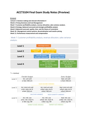 Topic 5: Decision making and relevant information II Week 6: Pricing Decisions and Cost Management Week 7: Customer profitability analysis, revenue allocation, sales variance analysis. Week 8: Strategy, balanced scorecard and strategic profitability analysis Analysis of how successful is the strategy implementation Week 9: Balanced scorecard: quality, time, and the theory of constraints Week 10: Management control systems, decentralisation and transfer pricing. Week 11: Performance measurement and compensation