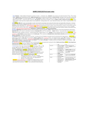 This is a 1 page double sided summary of entire course which is what you're allowed to take into exam. Covers extracts from relevant readings, key theories. Colour coded. The only thing you need to bring into the final exam! Content covers things like: - McGregor’s Theory X and Theory Y, weber’s theory of leadership, communication topic (chronemics, haptics), Festinger’s cognitive dissonance theory, week 10 elements of group structures. Summaries of readings: - Trompenaars & Wooliams, Francesco & Gold, Javidian, Patterson, Rosenbaum, Bauer & Taylor, Chapter 7 & 6 3 & 9, 5. - Summary table: Summary table of styles of persuasion, summary table of five steps of traditional decision making, Globe study of different cultural dimensions.