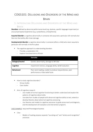 High quality cogs notes integrated into tables and diagrams where easier to understand. Case studies included. contents: First lecture = introduction Topic 1: Dyslexia Topic 2: Aphasia Topic 3: Specific Language Impairment Topic 4: Autism Topic 5: Synaesthesia Topic 6: Amnesia Topic 7: Modelling Delusions With Hypnosis Topic 8: Agnosia Topic 9: Delusions Topic 10: Schizophrenia Topic 11: Disorders of the Self