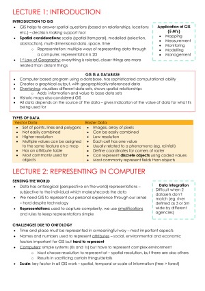 21 PAGES OF COMPREHENSIVE GEOM20013 NOTES - Notes covering week 1-12 of lectures - Topics covered: computer representation, spatial data, mapping, election support, decision support, urban planning GIS, multicriteria analysis, ethical considerations, oceanography, conservation + ecology, map production, emergency management, public health - Include diagrams, photographs and definitions from lectures to aid understanding and comprehension - Easy to read and follow, logical design and coloured to make engaging