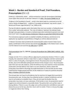 These notes are summaries on each of the topics covered in the 2016 Evidence Law classes. I consider it unlikely that there have been many alterations to the course structure since then, however the topics covered in these notes include: Introduction, Burden/Standards of Proof, Trial Procedure, Relevance, Witnesses and Examination and other evidence, Admissibility and Hearsay, Admissions and the Right to Silence, Opinion, Credibility, Tendency, Identification, Warnings, Vulnerability, Privileges and Immunity. Each summary has references to David Field & Kate Offer, Western Australian Evidence Law (LexisNexis Butterworths, 2015) and it would be highly advantageous to read these notes in tandem with the text.