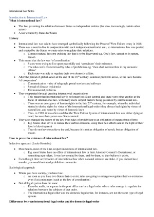 Detailed notes of the entire course, not suitable as a exam template Includes: Introduction to International Law Subjects - States, IO, other entities enjoying a degree of international personality Sources - Article 38(1) Law of Treaties - birth, life, conclusion State responsibility Diplomatic Protection Peaceful Settlement of Disputes Prohibition on the Use of Force Self Defence Collective Security International and Municipal Law relations Jurisdiction Immunity