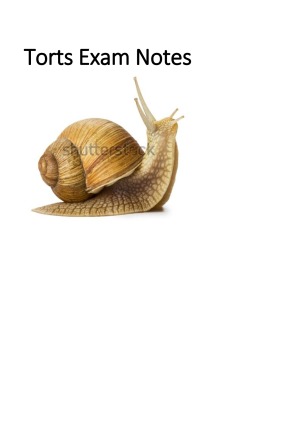 Detailed exam notes from Torts 2018 Topics Included; - Intentional Torts to the Person (Battery, Assault, False Imprisonment - Land based torts- trespass - Defences to intentional torts - Nuisance - Duty of Care - Breach of Duty - Causation - Medical Negligence - Liability of public bodies - Defences to Negligence - Vicarious liability - Personal liability