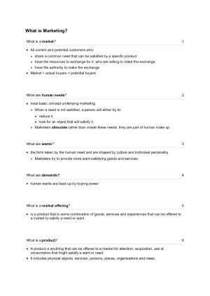 NOTES MADE TO GUARANTEE A DISTINCTION!! Using these notes, I achieved an easy 81% on the mid sem exam. Everything needed for the mid semester exam (from all necessary lectures) summarised into just 19 pages of notes including: - What is marketing? - Managing customer demand - Business & marketing planning - Business portfolio - Marketing strategy - Marketing Environment - Micro-Environment - Macro-Environment - Consumer Behaviour - Segmentation Notes written to maximise memory potential, phrasing the content as questions and providing exact and detailed answers (see preview). Notes perfect for anyone who wishes to achieve a distinction or higher in their mid semester exam.