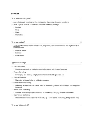NOTES MADE TO GUARANTEE A DISTINCTION!! Using these notes, I achieved an easy 81% on the final exam. Everything needed for the mid semester exam (from all necessary lectures) summarised into just 17 pages of notes including: - Product - Services - Brands - Product Life-Cycle - Promotion - Integrated Marketing Communication (IMC) - Digital Marketing - Personal Selling - Price - Place Notes written to maximise memory potential, phrasing the content as questions and providing exact and detailed answers (see preview). Notes perfect for anyone who wishes to achieve a distinction or higher in their final exam.