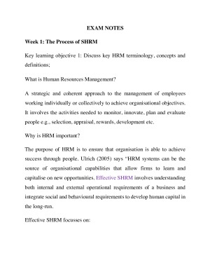 Topics covered: The Process of SHRM, Motivation and Organisational Change, Knowledge Management and Learning Organisations, Technology and SHRM, Diversity Management and Quality of Work Life, Ethics and the Law, Strategic International HRM (SIHRM), HR Planning, Job design, Recruitment and Selection, Training and Development. Notes are arranged on a weekly basis. Covers the weeks that are tested in the exams.