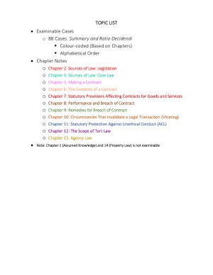- Complete ratio decidendi and summaries of all cases examinable (Color-coded to match the corresponding chapter of the book) - Succinct summary of all examinable chapters from both the book and lectures - Able to be compressed to 2 A4 pages (cheat sheet requirement) by using minimum margin and font of 6 (legible) *TOPIC LIST* • Examinable Cases: 88 Cases: Summary and Ratio Decidendi • Chapter Notes o Chapter 2: Sources of Law: Legislation o Chapter 3: Sources of Law: Case Law o Chapter 5: Making a Contract o Chapter 6: The Contents of a Contract o Chapter 7: Statutory Provisions Affecting Contracts for Goods and Services o Chapter 8: Performance and Breach of Contract o Chapter 9: Remedies for Breach of Contract o Chapter 10: Circumstances That Invalidate a Legal Transaction (Vitiating) o Chapter 11: Statutory Protection Against Unethical Conduct (ACL) o Chapter 12: The Scope of Tort Law o Chapter 15: Agency Law Note: Chapter 1 (Assumed Knowledge) and 14 (Property Law) is not examinable
