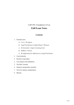 Things covered: - Coco v The Queen - Legal Practitioners Conduct Board v Thomson - K-Generation v Liquor Licensing Court - McBain v Victoria - Re-Application for Admission as a Legal Practitioner - Court hierarchy - Doctrine of precedent - Case analysis term definitions - The IRAC formula - Statutory interpretation checklist - Tools for statutory interpretation - Maxims Brief, concise and handy full examination notes for Foundations of Law