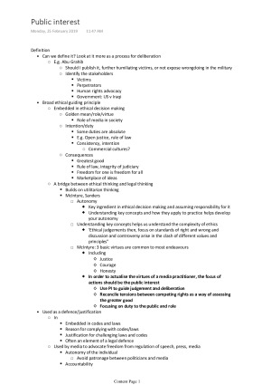 These notes cover all topics, including lectures, relevant theories/academics, readings and examples. Also able to be printed as open-book exam notes - Introduction/learning objectives - Ethics - Public interest - Responsibility and accountability: media regulation - Codes and self-regulation - Legal systems and contempt - Privacy law and policy issues - Defamation - Vilification - Copyright - Commercial media cultures - Current and future issues in media practice I also include info from slides that the lecturer skips and tells us to cover in our own time