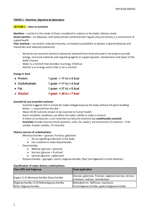 Comprehensive PHY3102 notes containing everything you need to know to get a HD in the unit - hence, the 96 pages! These notes summarise unit content from weeks 1-12. These unit notes are sequentially organised to flow seamlessly through the unit with clear colour coding and bolding to indicate important information. Topics include: Theme 1 - Nutrition, Digestion & Absorption Theme 2 - Regulation of Energy Expenditure & Intake Theme 3 - Obesity (Causes & Effects) Theme 4 - Obesity (Weight Loss & Therapies) This unit is quite content heavy thus, these notes will help consolidate key concepts that will be tested to ensure a HD grade!