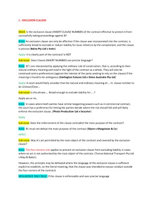 Contract Law notes, IRAC set out to answer exam questions easily and in a clear framework. TOPICS: Privity Pre contractual terms: Collateral contract, Displayed terms, rule in L ' Estrange & Graucob Construction of terms: Classification of terms Exclusion Clause Avoidance: Mistake, Duress, Undue influence, unfair terms, illegality, unconscionable conduct Performance: Termination by agreement, termination by breach, termination by frustration Damages Equitable Remedies