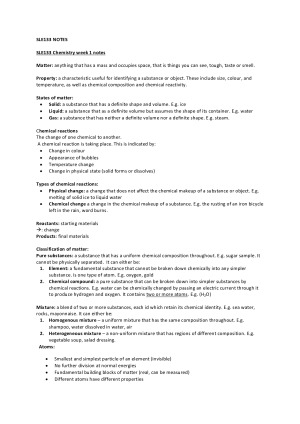 This document contains all content covered in weeks 1-10 of SLE133, summarised in an easy to follow reference. This document has been typed in an easily understandable, and simplified way. The content has been categorised weekly, which helps you isolate the content required for the weekly quizzes. Specific topics covered in this document include: - basic atom structures - SI units - periodic table trends - significant figures - scientific notation - ionic compounds - molecular compounds - Lewis structures - classification and balancing chemical reactions - chemical reactions: energy, rates and equilibrium - gases, liquids and solids - mixtures and solutions - acids and bases Additionally, this document contains easy ways to memorise important information using mnemonics, examples, diagrams and pictures, which are all beneficial for exams.
