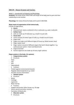 This document contains all content covered in HSB109 during weeks 1-11. It has been typed in an easily understandable and simplified way. Content has been categorised weekly for your convenience, allowing you to see the theory in perspective. Specific topics covered in this document include: - introduction to anatomy and physiology - homeostasis - organisation of cell - tissues of the human body - skeletal system - nervous system - endocrine system - immune system - cardiovascular system - respiratory system - digestive system This difficult subject is made easier through the use of tables, diagrams, mnemonics and examples.