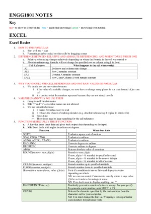 General Information: - Includes all topics from the lectures (listed below) - Also includes content covered in the tutorials that was not included in the lecture slides - Notes are organised by learning outcomes - Neatly set out and colour coordinated Topics for Excel: - Excel Basics - Functions & Plotting - Solving Equations & File I/O - Matrix Algebra Topics for Matlab: - Matlab Basics - If statements and arrays - Loops - Functions - Character strings & Text File I/O - Plotting - Matrix Algebra - Images & Movies - Interpolation & Curve Fitting