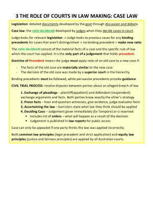 Professional quality notes from a H1 (92) student that will serve as an excellent study AND revision tool. Includes detailed information on ALL 12 WEEKS of LECTURE CONTENT and ALL ASSOCIATED TEXTBOOK READINGS: 1. General Introduction 2. Legislation as a Source of Law 3. The Role of Courts in Law Making 4. Contract Formation – Creating Legally Binding Contracts 5. The Terms of a Contract 6. Contract Performance and Breach 7. Remedies for Breach of Contract 8. Vitiating Factors 9. Australian Consumer Law 10. Tort Law 11. Agency Law 12. Course Review (guide to common mistakes) ❗️ THESE NOTES INCLUDE ALL EXAMINABLE MATERIAL COVERED FROM THE TEXTBOOK AND CAN THEREFORE BE USED AS A SUBSTITUTE FOR PURCHASING THE $100+ FPBL TEXTBOOK ❗️ These notes are suitable for: ✅ Students who are having trouble UNDERSTANDING the content and want a detailed explanation from a range of sources. ✅ Those who are looking to have a compact REFERENCE to assist during the semester. The coloured lecture summary boxes will assist you with regular revision, the case summaries of the key points will save you time searching and reading long cases and the clear structure and titles used in my notes will help you to find information quickly. ✅ Students who don’t want to or don’t have the time to read the textbook, attend lectures, read the cases, do the e-tutorials and CONSOLIDATE all of this knowledge into their own notes weekly. Alternatively, students that have fallen behind and can’t catch up on the sheer volume of content will benefit from my notes. ✅ Students who are preparing to do the MULTI-CHOICE QUIZZES and need detailed notes that are clearly structured to refer to, or who are preparing for the EXAM and need a clear collection of all examinable material that they can summarise into their cheat sheet. These notes contain: ✅ ALL CONTENT FROM THE LECTURES: Information from the lecture slides as well as additional oral explanations. While the lecture slides are brief and often cover a concept with a single dot point, my notes contain the oral, textbook and external explanations so each dot point is fully explained. ✅ SUMMARIES OF EACH CHAPTER: The coloured boxes at the start of each chapter contain the key points of each topic for quick and easy revision which should assist you in structuring your end-of-semester cheat sheet. ✅ IN-DEPTH ANSWERS TO ALL LECTURE CASE STUDIES: The text in black borders the end of each chapter includes discussions and answers to case studies that can otherwise only be accessed if you attend each lecture as they aren’t recorded in the lecture capture. ✅ ALL TEXTBOOK READINGS: All examinable concepts from the required readings are integrated into the relevant sections in my notes, meaning they can serve as a replacement for reading the textbook. ✅ ALL EXAMINABLE CASES: The grey boxes contain summaries of every examinable case from the textbook. They are grouped together with the relevant theory they apply to, making it easier to understand how the law is applied which makes the notes especially useful for answering the multiple-choice quiz questions under time pressure. ✅COLOURED DIAGRAMS AND ANNOTATIONS: These should provide visual aid to show relationships between concepts and help with recollection. ✅GUIDE TO COMMONLY MISUNDERSTOOD CONCEPTS AND QUESTIONS from week 12 These notes contain both the DETAILS to help you first understand the material and the SUMMARIES to help you revise and prepare your cheat sheet come exam time. They should serve as an effective CONSOLIDATION OF ALL EXAMINABLE CONTENT from all sources to save you time and effort. I hope they will be of just as much help to you as they were to me – Best of luck!