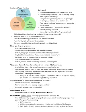 Course notes from the entire semester weeks 1-14 of BIOL2006 Research to Practice in Speech Pathology 1. Includes notes, diagrams and tables from lectures, research and textbook readings, organised by weekly objectives. Contains more detailed information on examinable content from weeks 10-14. Week 1 - Introduction to Research to Practice Week 2 - Critiquing the Evidence Week 3 - Bringing the Evidence Together Week 4 - Consideration of Client Factors Week 6 - Agency Factors Week 7 - Determining Appropriate outcome measures Week 10 - Paediatric Language DLD Week 11 - Paediatric Language Dyslexia Week 12 - Adult Language Working on the Impairment Week 13 - Compensating for Communication Difficulty Week 14 - Acquired Reading Difficulties