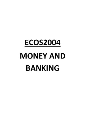 High quality notes that clearly, concisely and comprehensively outline the entire ECOS2004 course. Compiled from lecture notes, the textbook, extra readings and additional personal research. HD quality notes. These notes concisely cover the entire course and any of the relevant case study examples, graphs / tables / diagrams. Topic List: - Overview of the financial system - Money and the payment system; understanding interest rates - The behaviour of interest rates, traditional view; modern central banking view - Risk, the term structure of interest rates, commercial banking - The money supply process; traditional and modern views - Inflation targeting, contrasted with monetary targeting - The Global Financial Crisis - The current policy environment: Global - The current policy environment: Australia - How banks are regulated