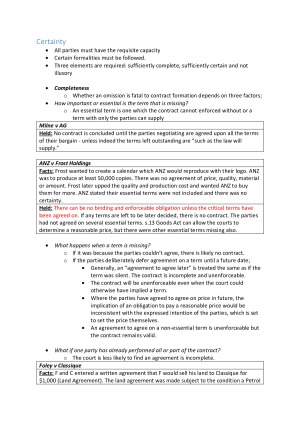 Very comprehensive notes covering the entire Contract A course. Includes summaries of all relevant cases and legislation as well as flowcharts on how to complete questions on each topic. I achieved an overall 80% for the unit using these notes. Topics Covered: Offer Acceptance Consideration Intention Certainty Formalities Privity Capacity Estoppel Express Terms (Identifying and Construing) Implied Terms Unfair Contract Terms and Consumer Law Statutory Guarantees