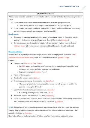 I obtained a HD by using these notes throughout semester. My Trust notes provides the method and steps to undertake to answer exam problems and the assignment (obtained HD for both) and case summaries within - really easy to follow through in an exam under stress! Clear headings and step-by-step style format. Topics include: - Certainty of intention - Certainty of subject matter - Certainty of objects - Quistclose trusts - Charitable trusts - Trustee's Duties - Defences and Limitations - ROI - Beneficiary's Rights - Remedies
