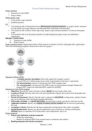 With this note you will have: 1. Topics 1 to 10 Topic 1 Introduction Topic 2 Project initiation and scoping Topic 3 Project Planning 1 Topic 4 Project Planning 2 Topic 5 Project Planning 3 Topic 6 Risk Management Topic 7 Stakeholder Management Topic 8 Project contract and procurement management Topic 9 Project organisation structure and governance Topic 10 Project implementation and performance measurement 2. Lecture 7 tutorial notes 3. Flow charts and graphs to help you better understand the topic; helpful for developing the major group project!