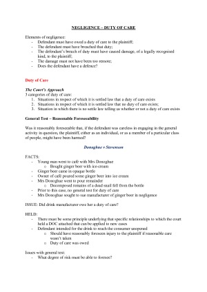Notes for LAW1113 from the textbook and videos provided on Moodle from weeks 1-12. Covers trespass to the person, trespass to land, private nuisance, duty of care, damages, vicarious liability, and defences. Also has detailed but succinct facts, issue, and outcome of every case listed in the reading guide.