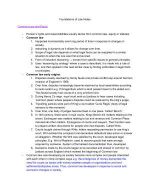 - Foundations of law notes colour coded and set out in dot points for an easy read! - These notes covers both lecture content and required and recommended readings from the unit. - Includes quotes from chief justices, examples for legal principles and useful analogies. - It includes all necessary legislation. - Includes all key legal principles and key information to pass exams, quizzes and everything is already summarised! Topics covered include: Common Law and Equity, The Constitution, Judicial Reasoning, Law Reform, The Judicature, Tribunals, International Law, Civil Procedure, Alternative Dispute Resolution and Democracy. Received a satisfactory mark for this course as end grade is either satisfactory/unsatisfactory.