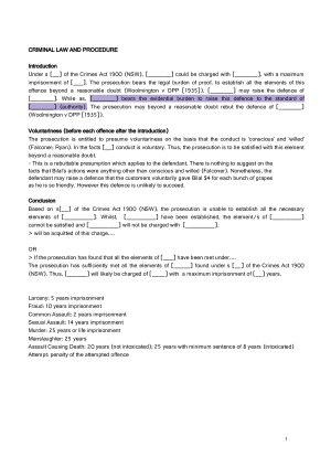Complete Notes put in a scaffold format so its easier for the final exam and problem question assessment. - Introduction, Voluntariness, Conclusion - Larceny - Fraud - Assault: Battery - Assault: Psychic - Sexual Assault Defences: - Automatism - Sane Automatism - Insanity - Duress - Self defence - Accessorial liability - Complicity - Joint criminal enterprise - Intoxication