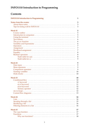 Complete course notes for INFO1110: Introduction to Programming. All code examples in Python with explanations. I received an overall mark of 92. CONTENTS: INFO1110 Introduction to Programming ├── Notes from the creator │ ├── About these notes │ └── Tips for doing well in INFO1110: ├── Week 01 │ ├── Course outline │ ├── Introduction to computers │ ├── Using the terminal │ ├── Text editors │ ├── The print function │ ├── Variables and Expressions │ ├── Operators │ ├── Assignment │ ├── Shorthand assignment │ ├── Equality │ └── Boolean operators │ ├── Truth table for and │ └── Truth table for or ├── Week 02 │ ├── Data types │ ├── More operators │ ├── Comparison operators │ ├── Naming variables │ └── Desk checks ├── Week 03 │ ├── Conditional flow │ │ ├── if keyword │ │ ├── elif keyword │ │ ├── else keyword │ │ └── Ternary operator │ ├── while loops │ └── Control flow diagrams ├── Week 04 │ ├── Lists │ ├── Iterating through a list │ ├── Modifying a list │ └── Filtering elements in a list ├── Week 05 │ ├── The type function │ ├── Functions │ │ ├── Why use functions? │ │ ├── Examples │ │ ├── Ending a function │ │ └── The difference between print and return │ └── Best practice │ ├── General rules │ └── Docstrings ├── Week 06 │ ├── Streams and files │ │ ├── Input and output streams │ │ ├── File types │ │ ├── File paths │ │ └── File modes │ ├── Opening files in Python │ │ ├── Reading from a file │ │ ├── Writing to a file │ │ ├── Using with to automatically close a file │ └── Exceptions │ ├── Difference between TypeError and ValueError │ ├── Using try and except │ ├── Using finally │ └── Handling multiple exceptions ├── Week 07 │ ├── Testing │ │ ├── Types of tests │ │ ├── What to test? │ │ └── Important keywords │ ├── Writing assertions │ ├── Writing in/out tests │ └── Comparing floating point numbers ├── Week 08 │ └── List idioms │ ├── Reading input until a sentinal value │ ├── Finding a specific value in a list │ ├── Counting the number of occurences in a list │ ├── Finding the max/min value in a list │ ├── Filtering a list in-place │ └── Filtering a list, without mutation ├── Week 09 │ └── Classes │ ├── Constructors │ ├── Instance vs class attributes │ └── Instance vs class methods ├── Week 10 │ ├── Test methodology │ ├── Test-driven development │ └── Debugging ├── Week 11 │ ├── Recursion │ │ ├── Why use recursion? │ │ ├── Why shouldn't we use recursion? │ │ └── Recap │ └── Writing a recursive function │ ├── Cumulative sum │ └── Factorials ├── Week 12 │ ├── Lists redux │ ├── Iterating through a 2D list │ ├── Arrays │ │ ├── Arrays vs lists │ │ └── Why use arrays? │ └── The numpy package │ ├── Importing numpy │ ├── Creating an array in numpy │ └── Iterating through a 2D numpy array └── Week 13 └── Revision questions ├── General programming ├── Testing ├── Functions ├── Classes and objects └── Recursion