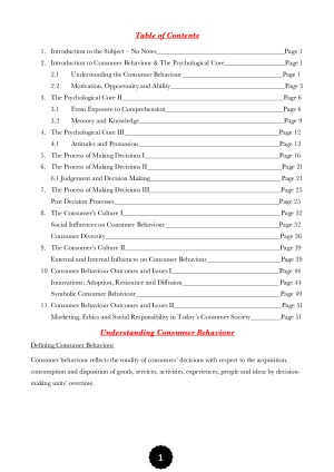 These are well-condensed but detailed notes on each topic to help prepare for mid semester quizzes and complement your study for Consumer Behaviour at University of Technology Sydney. The following notes contain diagrams and information to help clearly understand Consumer Behaviour - 24202 and includes notes from all lectures, tutorials and THE TEXTBOOK. Specifically, the following topics are covered: 1) Introduction to the Subject – NOT INCLUDED IN THE NOTES 2) Introduction to Consumer Behaviour & The Psychological Core 3) The Psychological Core II 4) The Psychological Core III 5) The Process of Making Decisions I 6) The Process of Making Decisions II 7) The Process of Making Decisions III 8) The Consumer’s Culture I 9) The Consumer’s Culture II 10) Consumer Behaviour Outcomes and Issues I 11) Consumer Behaviour Outcomes and Issues II Marketing, Ethics and Social Responsibility in Today’s Consumer Society 12) Guest Lecture - NOT INCLUDED IN THE NOTES Goodluck and thank you for using those notes. Note: The sample notes contain 10% of the complete notes.