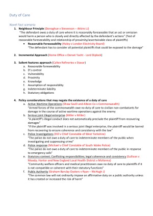 Comprehensive and concise step-by-step scaffolds that are ideal for closed book problem question exams. ALSO AVAILABLE: This scaffold is useful alongside the more detailed Tort Law Notes (available separately). Topics include: 1. Duty of Care - Established Duty - Novel Fact Scenario - Psychiatric Injury 2. Breach of Duty 3. Causation 4. Defences - Contributory Negligence - Volenti non fit injuria - Illegal Conduct - Intoxication - Self Defence - Children - Disability 5. Damages 6. Vicarious Liability - Personal Liability - Vicarious Liability - Non-delegable Duty 7. Joint and Several Liability 8. Compensation to Relatives 9. Survival Actions 10. Action for Loss of Services
