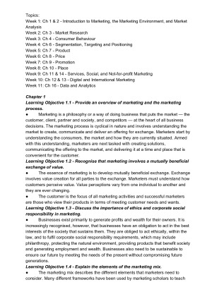Summaries from readings in Textbook. Topics: Week 1: Ch 1 & 2 - Introduction to Marketing, the Marketing Environment, and Market Analysis Week 2: Ch 3 - Market Research Week 3: Ch 4 - Consumer Behaviour Week 4: Ch 6 - Segmentation, Targeting and Positioning Week 5: Ch 7 - Product Week 6: Ch 8 - Price Week 7: Ch 9 - Promotion Week 8: Ch 10 - Place Week 9: Ch 11 & 14 - Services, Social, and Not-for-profit Marketing Week 10: Ch 12 & 13 - Digital and International Marketing Week 11: Ch 16 - Data and Analytics Enjoy :)