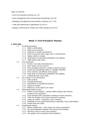 Thorough exam notes for civil procedure. Topics covered include: - Core civil procedure themes - Case management and commencing proceedings - Pleadings and gathering documentary evidence - Trials and interlocutory applications - Appeals, enforcement, finality and costs disputes
