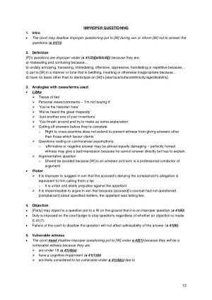 Topics covered: - Relevance - Discretion to exclude evidence - Competency & Compellability - Privilege (privilege against self-incrimination; client legal privilege; settlement negotiations, public interest immunity) - Examination in chief (leading questions, retrieving information, prior consistent statements, unfavourable witnesses) - Cross examination (about prior inconsistent statements; character of the accused) - Tendency evidence - Co-incidence evidence - Hearsay evidence (non-hearsay purpose; first-hand hearsay; Section 66A exception; business records exception) - Right to silence - Admissions Contains templated sentences.