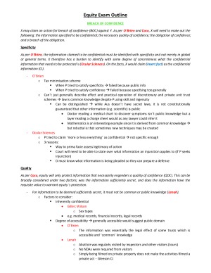 Final exam notes containing all relevant case law and legislation. These notes compile lecture content, tutorial content and textbook readings into a format that is easy to apply for exam purposes. Headings include: - Breach of Confidence - Breach of Fiduciary Duty - Personal Remedies - Proprietary Remedies - Assignment of proprietary interests Do note that these are student notes and are not meant to replace what is taught in the course. When in doubt, follow the direction and advice of lecturers and tutors.