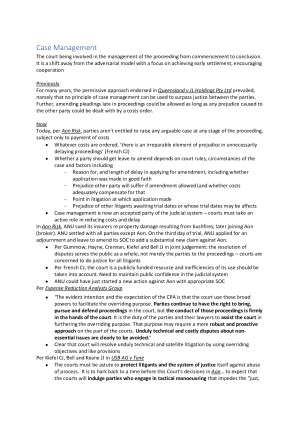 Comprehensive, well-structured exam notes including case summaries and exam scripts. These notes are detailed and structured in a way that allows you to quickly navigate to the relevant section and establish the key principles immediately. Contents Case Management Civil Procedure Act 2010 (Vic) Jurisdiction Subject Matter Jurisdiction Territorial jurisdiction Cross vesting of jurisdiction Parties and Causes of Action Identifying a Defendant Causes of Action Joinder of Claims and Parties – Order 9 Addition, removal and substitution of a party Consolidation Non-parties seeking to participate Instituting Proceedings Client Management Originating Process Service Appearance Pleadings Class Actions Methods of Gathering Evidence Discovery Other Methods of Gathering Evidence Subpoenas Expert Evidence Urgent Applications Interlocutory Orders Costs Disposition, Settlement and Enforcement Pre-litigation offers Facilitating Settlement Summary Disposition Enforcement Appropriate and Online Dispute Resolution ADR Processes Online Dispute Resolution