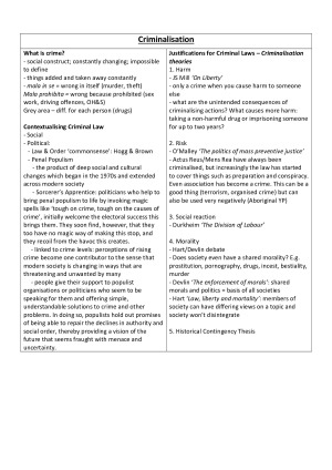 These notes are based off the course textbook (Criminal Laws- Materials & Commentary 6th ed by Brown, Farrier, McNamara, Grewcock & Schwartz) as well as notes made by Helen in class. These are perfect to use in an exam and saved me heaps of time searching through the textbook, and were perfect for revision as well. I also went back to them during CRIM2021 so they're super helpful. They include all course content including: - Criminalisation - Process (Police powers, discretion, pre-trial process, the process as punishment and ATSI involvement) - Offence elements (Legal personhood, Actus Reus/Mens Rea) - Public Order Offences (Offensiveness) And heaps of definitions and case references.