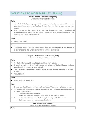 THIS DOCUMENT HAS A SUMMARY FOR EVERY SINGLE CASE IN THE UNIT GUDIE (TRI 2 2019) for the following topics: 1. Torrens System and indefeasibility 2. Scope fo Indefeasibility 3. Exceptions to indefeasibility (fraud etc.) 3. Co - Ownership 4. Equitable interests/ Trusts 5. Protecting interests 6. Priority Disputes This is perfect to have on hand throughout the trimester and in exams.
