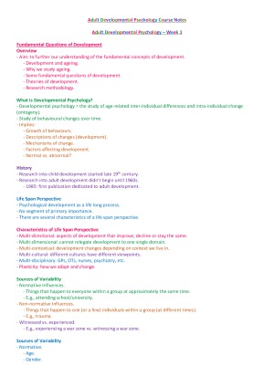 Course notes from the entire semester of PSYC3003 Adult Developmental Psychology. Includes notes from lectures and tutorials, organised by week, as well as a compiled notes section at the end for revision. Are 'colour-blocked' for ease of reading and studying. Received distinctions high distinctions on all assessments and an overall mark of 85% in this unit. Topics covered include: fundamental questions of development, physiological development, theories of adult development, work & career development, cognitive development, social & emotional development, working with older adults, mental health in older adults, non-suicidal self-injury in emerging adulthood, and grief & loss.