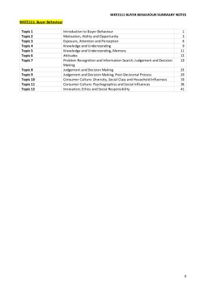 Organised and colour coded notes for MKF2111 (Buyer Behaviour). Include notes from online lectures, lecture readings, tutorial readings and class discussions. Definitions are outlined in blue font. Examples are outlined in purple font. Topic 1: Introduction to Buyer Behaviour Topic 2: Motivation, Ability and Opportunity Topic 3: Exposure, Attention and Perception Topic 4: Knowledge and Understanding Topic 5: Knowledge and Understanding, Memory Topic 6: Attitudes Topic 7: Problem Recognition and Information Search; Judgement and Decision Making Topic 8: Judgement and Decision Making Topic 9: Judgement and Decision Making; Post-Decisional Process Topic 10: Consumer Culture: Diversity, Social Class and Household Influences Topic 11: Consumer Culture: Psychographics and Social Influences Topic 12: Innovation; Ethics and Social Responsibility