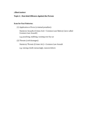 LAW5001 Exam-formatted Notes (Monash JD). Subject completed in Trimester 2 2019 - received Distinction for subject. Topics include: 1. Non-fatal offence against the person; s 16, 17, 15A, 15B, 18, 24, 20, 21, common law 2. Homicide; murder, UDA mansalughter, negligent manslaughter, manslaughter by omission 3. Self-defence provisions; s 322K, 322M, 322J, Jury Directions Act 2015 4. Sexual offences; s 38, 39, 40, Jury Directions Act 2015 5. Property offences; s 74, 81, 82, 75, 75A, 76, 77 6. Attempts; s 321N 7. Criminal procedure Notes include template of exact words to use for charge, alternative charge and defence (including the exact words to be used in exams as recommended by a newly appointed judge), contains case authorities and legislation to cite, arguments and counterarguments (Prosecution and Defence), and is formatted for ease of use (reference) during exams. Notes include all weeks for the subject.