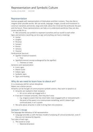 Notes covering the lecture material for Representation. These were especially handy during the exam revision process, helping me get a score of 86. Topics included: - Representation and symbolic culture - How to read film - Gender in Double Indemnity - Feminist critique of film - Petrarch - Shakespeare's sonnets - Modern theatre and epic theatre - Mother Courage - Performance and representation - Guernica - Picasso's legacy - Dance and representation - Private passions and company priority - Popular screendance - Review/exam info