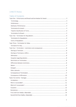 The notes include a comprehensive outline of all of the topics covered in LAW272. I used these notes for my assignment, exam preparation and my exam.