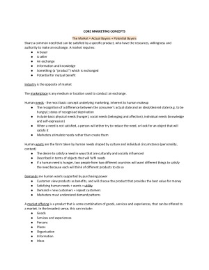 Received on mid-sem exam in Sem 1, 2019. Lectures/weeks 1-5. Contains brief introduction to marketing, core marketing concepts, strategic planning + the marketing process, environmental analysis, consumer behaviour, segmentation analysis + targeting. Includes diagrams, real-life and theoretical examples, learning outcomes (so you know what's important in the exam!!), and textbook notes (note: these are synthesised throughout notes and not signposted as such)
