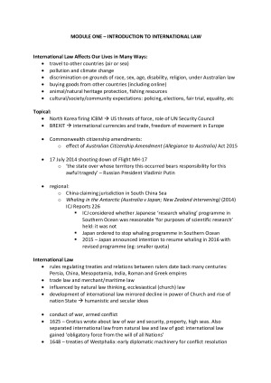 All module / lecture notes. Module 1 – The Nature of International Law Module 2 – Sources of International Law Module 3 – The Law of Treaties Module 4 – International Law and Australian Law Module 5 – Human Rights Law Module 6 – Personality and Recognition Module 7 – Jurisdiction and Immunities Module 8 – State Territory Module 9 – State Responsibility Module 10 – The Use of Force Module 11 – Law of the Sea Module 12 – International Environmental Law
