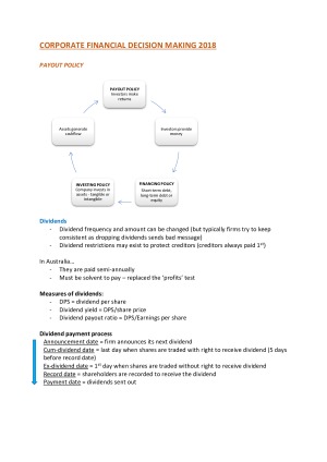 Succinct and complete Corporate Financial Decision Making notes covering all relevant material to prepare for the exam. Includes notes on each topic of the lectures including formulas. Lecture 1: Payout policy, share buybacks Lecture 2: WACC and Capital Structure - Lecture 3 + 4: Capital Budgeting - Lecture 5: Raising Capital - Equity - Lecture 6: Raising Capital - Debt, Regulatory environment - Lecture 7: Advanced Capital Budgeting and Investment Policy, NPV analysis - Lecture 8 + 9: Takeovers and Economic Evaluation of Takeovers, regulatory issues - Lecture 10: Corporate Restructuring